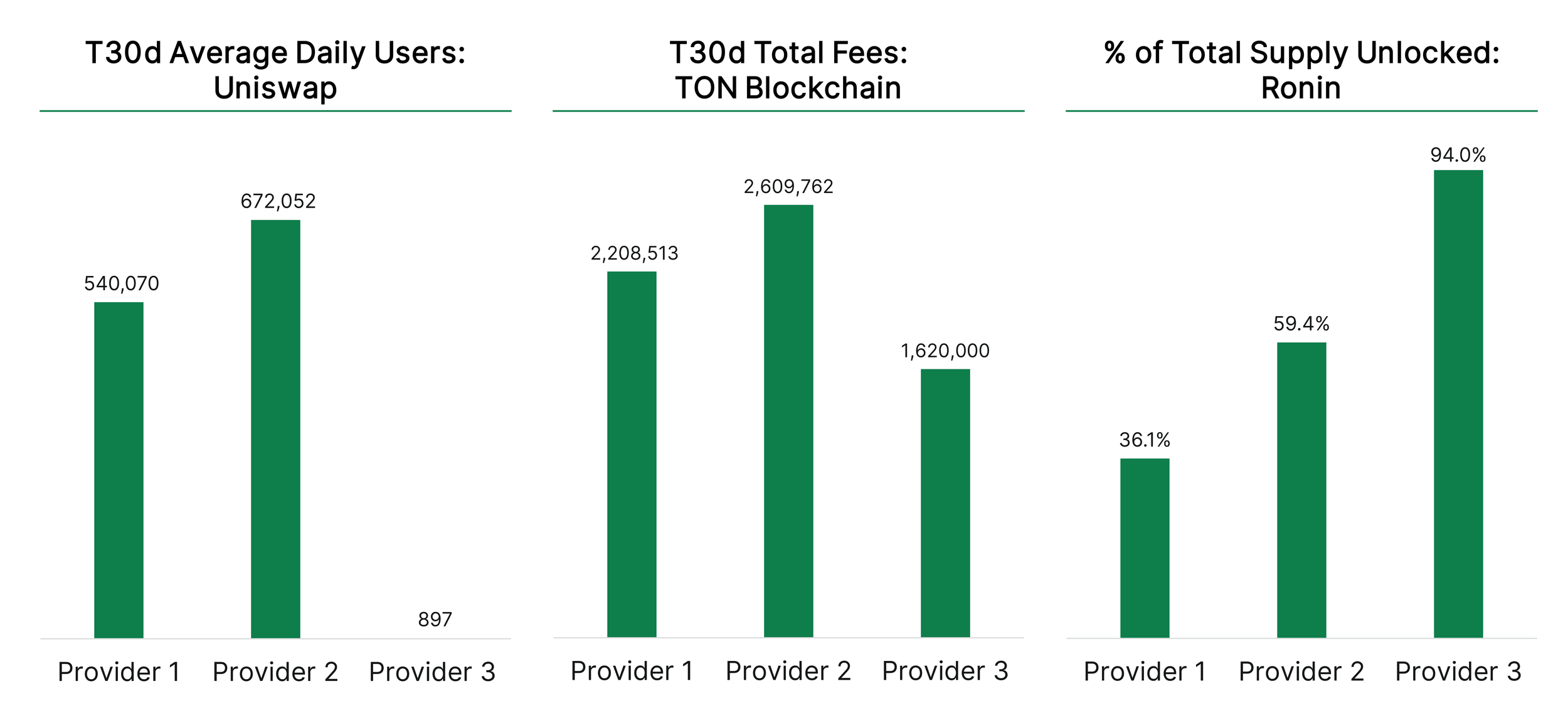 This inconsistency makes it essential to scrutinize the methodologies behind the numbers. In the charts below, we highlight a few cases of projects and associated metrics sourced from various data providers. Clearly, the reported figures for the ‘same’ metric vary widely. It’s not as simple as one source being ‘right’ and the other ‘wrong’ - different values can have validity, but understanding the methodology is key, in order to enable a fair comparison.